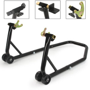 Wsporniki do podnoszenia przednich kół motocykla. Dzięki podparciu pojazdu ludzie mogą łatwo czyścić i konserwować rower w domu lub w warsztacie naprawczym i mogą być używane razem lub osobno. Umożliwia ustawienie motocyklu (np. podczas naprawy) w wygodnej pozycji nie obciążając opon. Kompatybilny z większością modeli marek. Przydatny w każdym garażu oraz warsztacie.