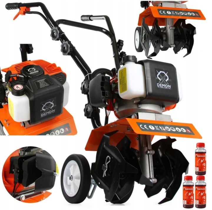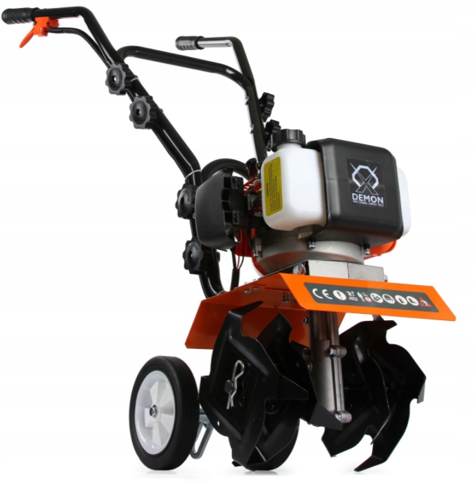 - Glebogryzarka DEMON®️ wyposażona jest w dźwignię regulatora głębokości roboczej – niżej = Mniejsza głębokość pracy