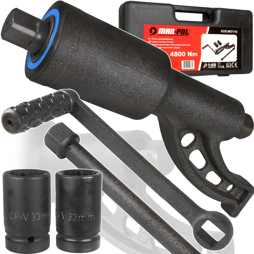 Dzięki kompaktowym rozmiarom oraz wygodzie użytkowania narzędzie to staje się niezastąpionym wyposażeniem każdej ciężarówki, TIR-a oraz różnego rodzaju pojazdów i maszyn rolniczych lub budowlanych. Ze względu na swoją konstrukcję klucz możemy dopasować praktycznie do wszystkich spotykanych kół ciężarowych. Trzpień 1″ jest kompatybilny z wszystkimi nasadkami 1″ stosowanymi w innych narzędziach. Wystarczy nałożyć jedną z dwóch dostępnych nasadek 32mm lub 33mm, poluzować śrubę kluczem, następnie użyć dołączonej przedłużki, aby błyskawicznie odkręcić każdą śrubę.
