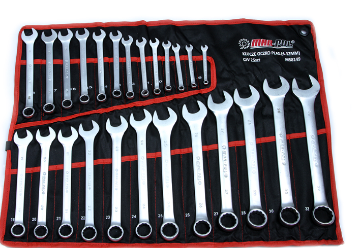 Bardzo wysokiej jakości klucze płasko-oczkowe wykonane ze stali chromo-wanadowej. Przeznaczone do pracy zarówno w warunkach domowych jak i w profesjonalnym warsztacie. Spełniają normy DIN 3113. Klucze mają estetyczne satynowe wykończenie. Całość zapakowana została w wygodne zwijanie etui, dzięki czemu zajmuje mało miejsca. Pokrowiec wykonany jest z bardzo mocnego i wytrzymałego materiału, a otwory w jego górnych rogach umożliwiają powieszenie ich na ścianie.płaszczyzna robocza odchylona o 15% (ułatwia manewrowanie kluczem)12-kątna końcówka kluczasatynowe wykończenie, minimalizujące poślizg klucza zanieczyszczonego olejemzaokrąglone kształty przejścia między główką klucza i rękojeściądoskonale wykalibrowanyspełniają normy DIN 3113W SKŁAD KOMPLETU WCHODZĄ KLUCZE:6; 7; 8; 9; 10; 11; 12; 13; 14; 15; 16; 17; 18; 19; 20; 21; 22; 23; 24; 25; 26; 27; 28; 30; 32 mm w praktycznym pokrowcu.