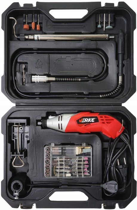 Wielofunkcyjna szlifierka marki Verke to urządzenie, które doceni każdy pasjonat modelarstwa, profesjonalny rzemieślnik czy entuzjasta majsterkowania. Można nią polerować, rzeźbić, szlifować, grawerować i usuwać rdzę z różnych przedmiotów. Multiszlifierka sprawdzi się w pracy z drewnem, tworzywem sztucznym, ceramiką, metalem. W komplecie znajduje się pełen zestaw akcesoriów wpływających na wygodę użytkowania. Oprócz tego mini szlifierka posiada elastyczne przyłącze, przydatne zwłaszcza podczas pracy w trudno dostępnych miejscach oraz praktyczny stojak. Dodatkowo szlifierka wyposażona jest w odpinaną lampkę która pozwoli Ci doświetlić ciemne miejsca podczas pracy. Przycisk blokady umożliwia szybką wymianę końcówek. Regulacja obrotów zapewnia dopasowanie prędkość pracy do rodzaju obrabianych materiałów. Mini szlifierka to idealne urządzenie do pracy w warsztatach: szlifierskich, grawerskich, polerskich, frezerskich i prac jubilerskich, modelarskich, hobbystycznych. Całość została zapakowana w mocą walizkę pozwalającą utrzymać porządek po skończonej pracy i ułatwia przechowywanie.