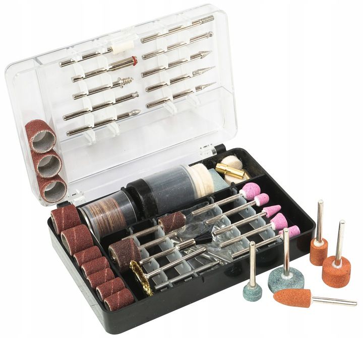 akcesoria (tarcze do cięcia, wrzeciona do mocowania ściernic tarczowych, taśmy szlifierskie, uchwyty do taśm, rylce grawerskie, tuleje, osełka, kamyki, filce, frezy, wiertła, papier ścierny, pędzelek, druciak itp.)