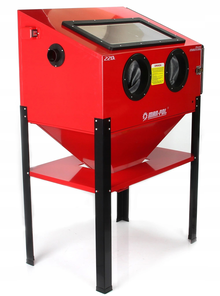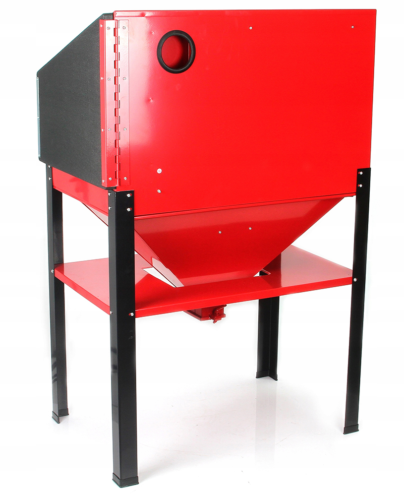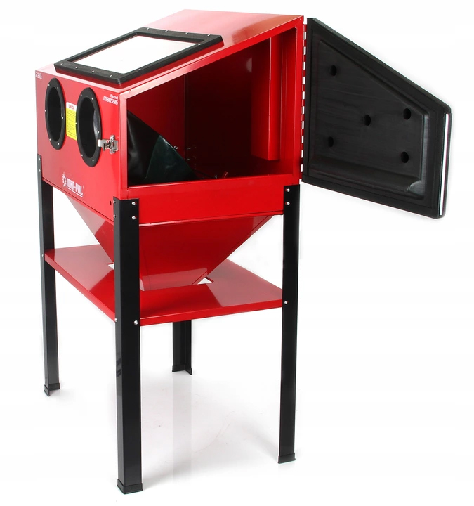 Maszyna wyposażona została w sprawdzony system sterowania, solidną i pojemną komorę z bocznymi drzwiami, solidny pistolet do piaskowania, cztery dysze ceramiczne, wysokojakościowe rękawice robocze, oświetlenie przestrzeni roboczej, duże okno – wizjer (bez martwego pola). Polecane urządzenie zapewnia oprócz kompaktowej budowy oraz dużej i pojemnej przestrzeni roboczej, łatwość obsługi, niezawodność oraz bezpieczeństwo pracy. Bezpyłowa praca urządzenia zapewniona jest dzięki zastosowaniu uszczelek obwodowych, pozwala to na wykonywanie pracy w sposób przyjazny dla środowiska. Wąż do piaskowania umieszczony został w dolnej części pojemnika zbiorczego. Otwór odpływowy umożliwia szybką zmianę materiału do piaskowania.