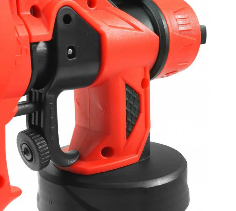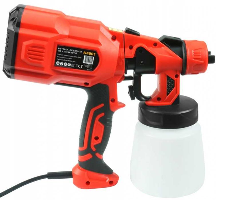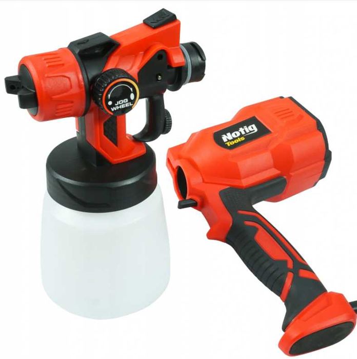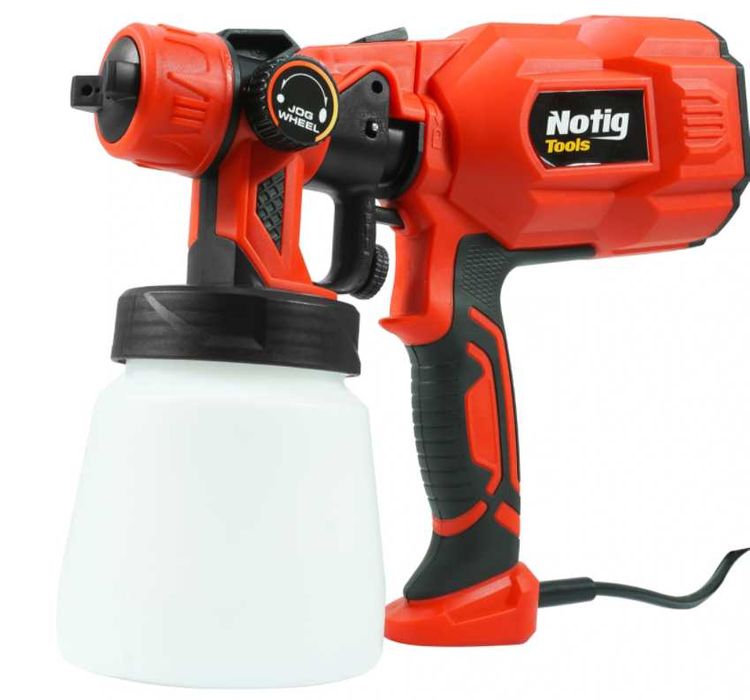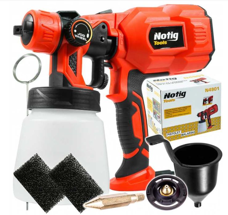 Elektryczny pistolet do malowania marki Notig Tools został wyposażony w wytrzymały i wydajny silnik o mocy 550 W. Urządzenie umożliwia nanoszenie farb o różnych gęstościach, farby na bazie wody, rozpuszczalnika, lakiery, podkłady, farby wykończeniowe, uszczelniające czy do gruntowania drewna. Dzięki natryskowi można pomalować szybko i dokładnie trudno dostępne miejsca, umożliwia równomierne pokrycie farbą nieregularnych powierzchni. Odpowiedni strumień otrzymujemy obracając dyszą. Dzięki wbudowanej sprężarce nie wymaga zewnętrznego zasilania sprężonym powietrzem. Włącznik w spuście pistoletu posiada regulacją przepływu farby.