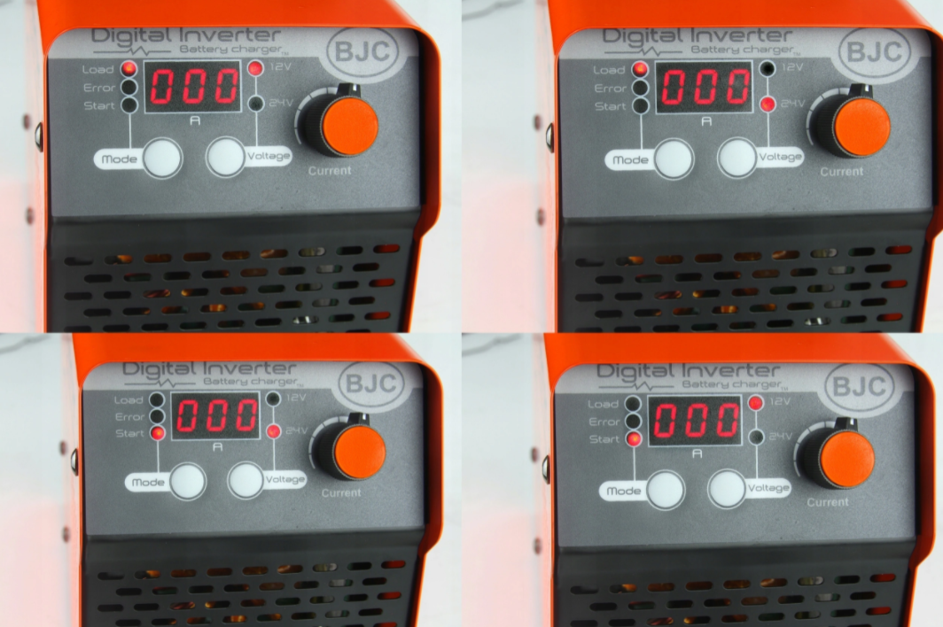 Prostownik inwerterowy BJC został wyposażony w niezwykle prosty i przejrzysty panel sterowania z wyświetlaczem LED, diodami sygnalizacyjnymi i potencjometrem.