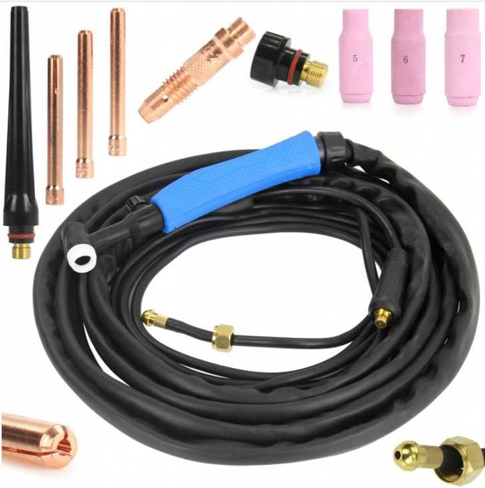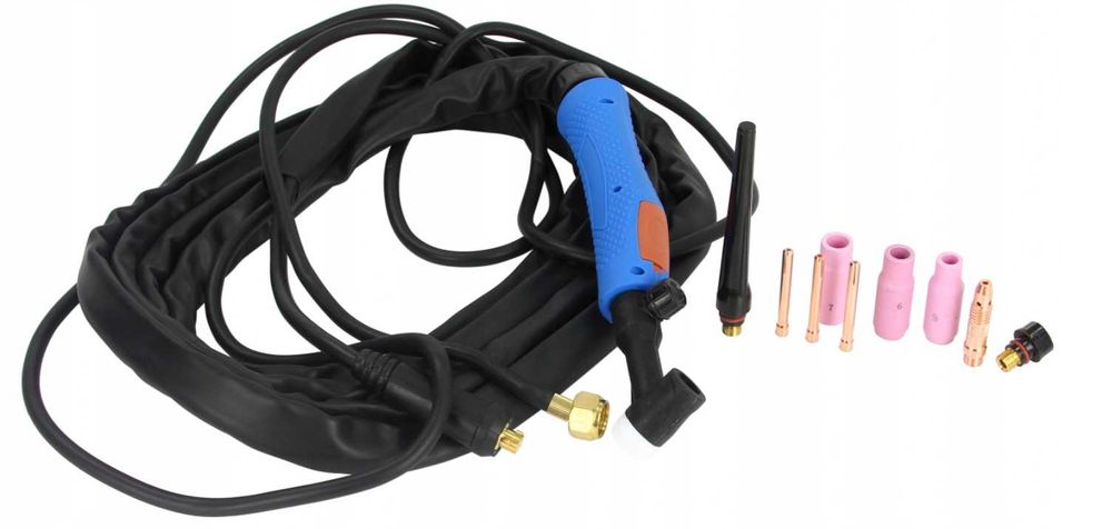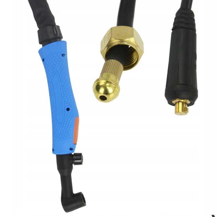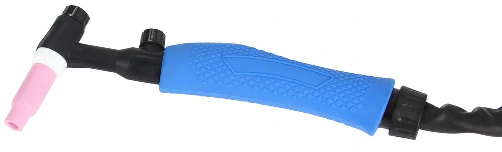Uchwyt spawalniczy TIG z przyłączem 10-25 - ok. 4m przewód gazowy długości ok. 6 m umożliwiający swobodne podpięcie butli z dala od spawarki co ma istotne znaczenie dot. bezpieczeństwa. Nakrętka przewodu gazowego do reduktora to 19mm